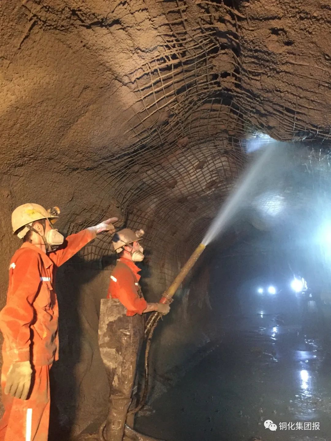 圖為澆砼工向井下巷道頂板噴射混凝土,確保頂板安全。